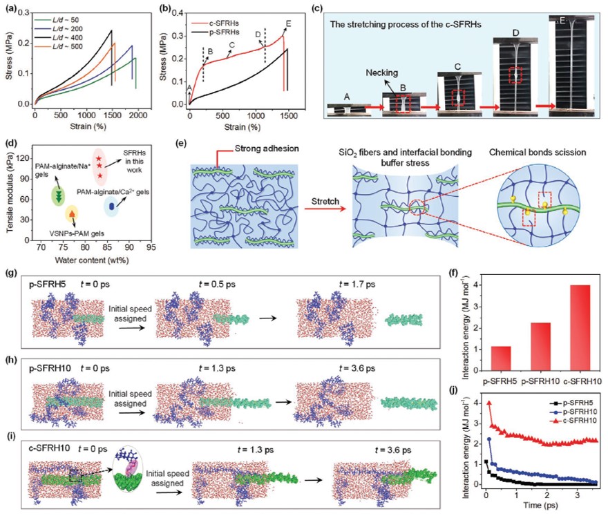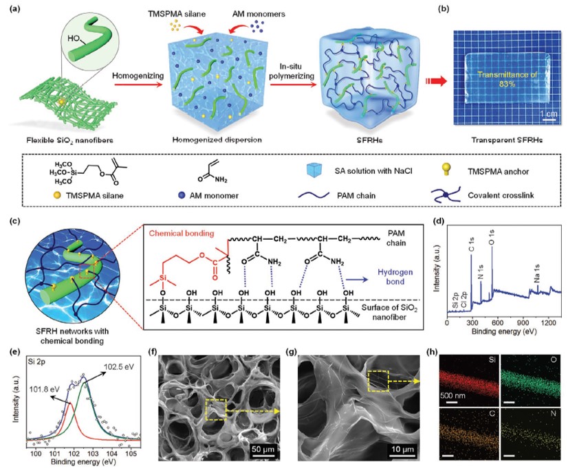 研究團隊將二氧化硅納米纖維、乙烯基硅烷巧妙地整合入海藻酸鈉(SA)/聚丙烯酰胺(PAM)水凝膠中,制備了一種透明納米纖維增強的SFRHs水凝膠,其中PAM鏈通過硅烷共價連接到二氧化硅納米纖維上,形成堅固的界面化學鍵。此外,二氧化硅納米纖維和PAM鏈之間的界面提供了非共價的相互作用(例如氫鍵),在拉伸過程中可能會斷裂和重組,耗散能量并使水凝膠網絡均勻化。