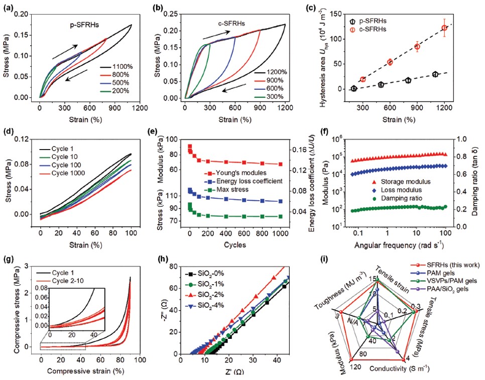 與p-SFRHs的小滯后相比,c-SFRHs在加卸載循環實驗中表現出更大的滯后,而卸載后的永久變形幾乎可以忽略不計,突出了其韌性和超彈性。經過1000次循環拉伸試驗后,c-SFRHs的楊氏模量、較大應力和能量損失系數均沒有顯著下降。與脆性的傳統水凝膠相比,SFRHs顯示出強大的壓縮回彈性和高壓縮應力(90%應變時為2.6 MPa)。此外,它們可以在如此大的應變下被反復壓縮而不會發生結構坍塌。另外,實驗發現隨著二氧化硅納米纖維含量的增加,阻抗逐漸降低,表明SFRHs的離子電導率呈不斷增加的趨勢。離子電導率的提高歸因于兩個效應:首先,非導電性二氧化硅納米纖維在復合水凝膠中占有較小的體積,確保了離子在水中的高遷移率。其次,具有高長徑比和酸性表面(-OH基)的二氧化硅納米纖維吸引反離子,在整個水凝膠中形成一個連續的高導電通道。